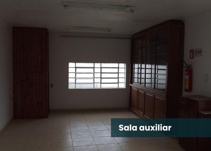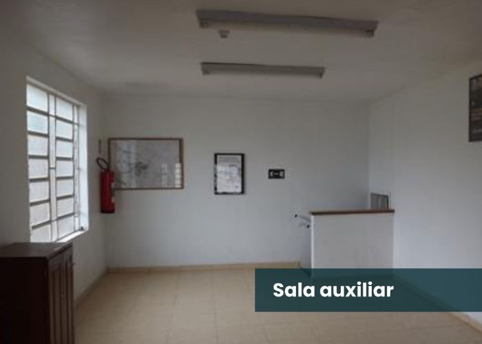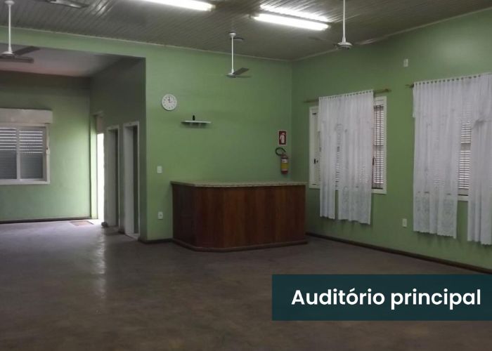 – Auditório amplo, dois banheiros, um depósito, uma sala auxiliar e uma vaga de garagem.